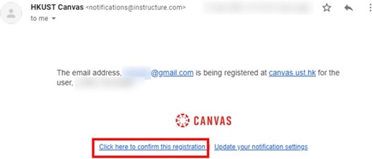 3.2. Check your personal email and look for the confirmation email from Canvas > Select “Click here to confirm this registration”. If the email is not in your inbox, please check your spam box.