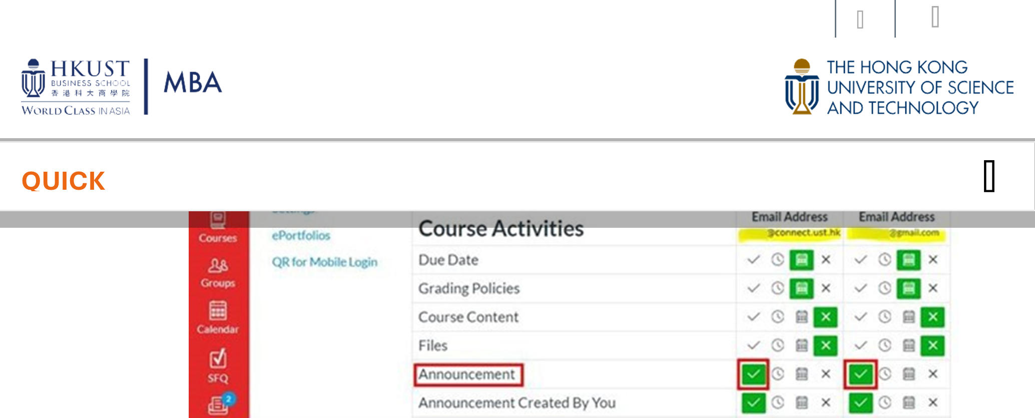 - HKUST Canvas is an e-learning platform where faculty and MBA office will upload course-related materials, lecture notes, broadcast announcements and host group discussion.