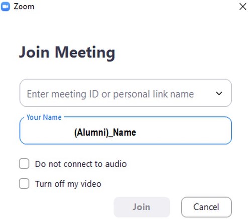 - Set your display name as “Alumni)_Name” to facilitate attendance tracking. Failure to display your name properly may result in being marked absent.